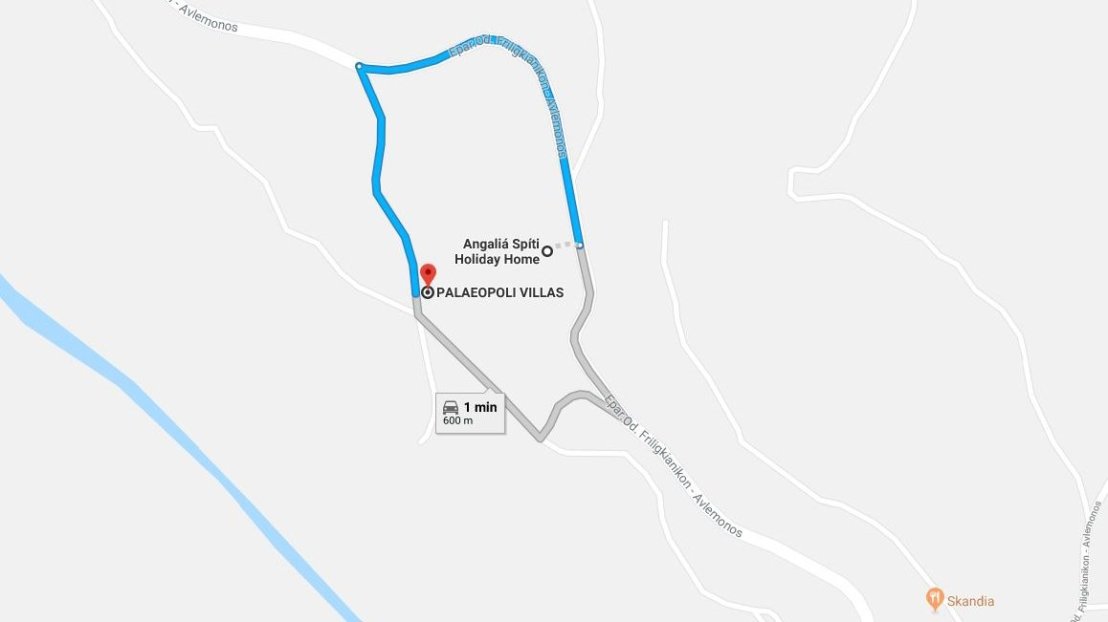 When leaving the port area, you simply have to follow the road leading up the hill and after driving for 4.7 km you turn left in the direction of Avlèmonas. Follow this road until after 3.5 km you arrive at a T-junction (close to the sea) where you turn right in the direction of Paleópoli. After 1.3 km (just after Skandia restaurant) you turn right.
