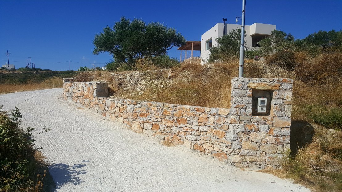 Now follow this (long and winding…) road, where you pass a new bridge and after an extra 2.2 km you will arrive at Angaliá Spíti on the right side of the road. The driveway is right next to a natural stone wall also marked with a green reflecting sign with the number “42“.